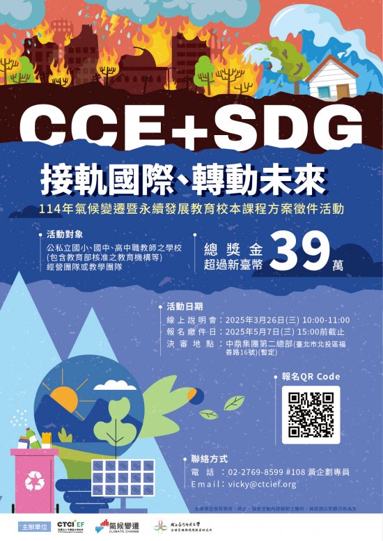 一、為強化我國各級教育人員對於氣候變遷教育(CCE, climate change education)、永續發展教育(ESD, education for sustainable development)與聯合國永續發展目標(SDGs)的認識,響應我國《氣候變遷因應法》對於氣候變遷教育的重新定位,與賴總統於國家氣候變遷對策委員會第三次會議之指示(https://www.president.gov.tw/News/39011),朝向「氣候變遷暨永續發展教育」(CCESD=CCE+ESD) 國際趨勢邁進,連結永續發展目標(SDGs)後,成為 CCESDG 。中鼎教育基金會(CTCIEF) 特與教育部氣候變遷教學資訊平臺氣候變遷教育推動計畫、國立臺灣師範大學永續管理與環境教育研究所共同籌辦旨揭徵件活動,以鼓勵教師研發「氣候變遷暨永續發展教案」。 |